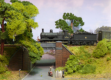 No images of the original road bridge exist; built for the opening of the line in 1848, it was severely damaged by flooding in October 1875. The report states that the situation occurred in part due to the roadway having been lowered to give adequate headroom under the bridge. A temporary single track track timber structure carried "piloted" rail traffic while a permanent replacement was being built. The replacement bridge received the inspector's seal of approval 28th March 1876. In had stout supporting brickwork tapering upwards with buttresses on each side, to compensate for the roadway not being at right-angles to the track. Four capped wings retained the earth embankment. A photograph taken in 1965 shows the original span replaced and the brickwork taken down to track level. It is reported that the steel work was replaced during the early 1920's when a forge was established in the roadway below and the blacksmith would throw the white hot rivets up to the workers re-building the span. The 1875 bridge was selected as the prototype to be modelled; a photograph taken around 1910 being the main source of information for the plans.