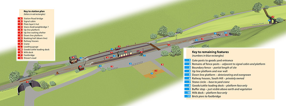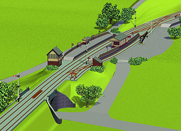 The track plan at this location is not the original; following the inspection of the station complex at the time of opening, the inspector raised concerns that passengers had to cross the goods loop at the north end to gain access to the platforms. The suggestion to move the booking hall to the southbound platform and vise versa did not prove feasible, but shortly following opening, extra pointwork had been installed at the north end of the site enabling wagons to be propelled into the carriage/cattle dock directly from the main line, alleviating the need to negotiate the foot crossing at the north end.