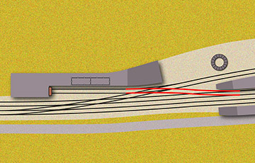 Leaving the platforms, to the right, the carriage/cattle dock spurs off from the goods loop. A short dock, it accommodates four wagons and adjoins an end-loading facility for the purpose of propelling road wagons or carriages on or off flat railway trucks. The prototype buffer stop of a type suitable for end-loading survives, so reference gathering in this area could not have been simpler.