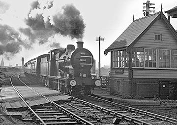 From the downline or northbound platform a passenger could travel east or west, therefore excursion trains to the coast in either direction became a regular seasonal part of the traffic. Remaining on NSR metals, two popular destinations were Alton Towers and Trentham Gardens, but further afield, Llandudno and New Brighton were frequently visited by, among others, the choir of Saint Mary's (Rolleston) Parish Church. Trains bound for the east coast would join the GN route at Dove Junction, travelling to Scegness and other Lincolnshire resorts via Derby Friargate and Nottingham Victoria. Excursion workings continued to call at Rolleston-on-Dove for some years following the station's closure. The photograph taken at Horninglow in October 1965 shows the last excursion, infact this final passenger train to traverse the route did stop at Rolleston-on-Dove station. A regular Saturday only, summer working was the Kings Norton /Scegness; not booked to stop at Rolleston-on-Dove, it would call at Eggington Junction to connect with the ex Crewe and Stoke train before proceeding to the east coast via Derby Friargate.