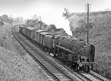 Towards the time of the line's closure, goods trains became much shorter, as can be seen in the photograph of the class 9F, 2-10-0 locomotive and train, about to pass under the footbridge.