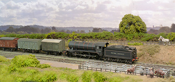 Apart from through workings by the NSR to and from the Stoke-on-Trent area and those mentioned, LNWR and GNR freight trains using Horninglow goods yard and Hawkins Lane goods station, via the Hawkins Lane branch, regularly passed through the station. Of particular interest was the nightly Burton/York beer train, in LNER/BR days, usually handled by York based B16, 4-6-0 locomotive crewed by Annesley (Nottingham) men. When Burton bound, the locomotives on these turns worked tender first from Egginton Junction, as seen in the model photograph, to avoid using the Hawkins Lane turntable. It was essential that the locomotive climbed the steep embankment leaving Burton, via the Hawkins Lane branch, in Chimney first mode.