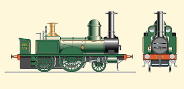 Early motive power for this much-loved local train is shown as an artist's impression of NSR no. 8 on the panel top right; built 1848 by Hick & Sons at the Soho Works in Bolton as a 2-4-0, tender locomotive, it was converted to a 2-2-2 "single" tank engine to work the Burton/Tutbury service. Following its involvement in a fatal accident near Rolleston-on-Dove in 1861 it was re-numbered as no. 5 in 1870 and scrapped in 1881. This illustration has now been updated to match a drawing of the prototype, recently discovered, and its livery altered to represent the green livery worn by early NSR locomotives..